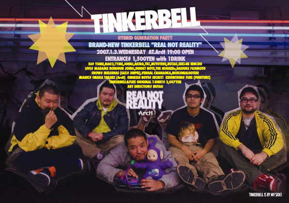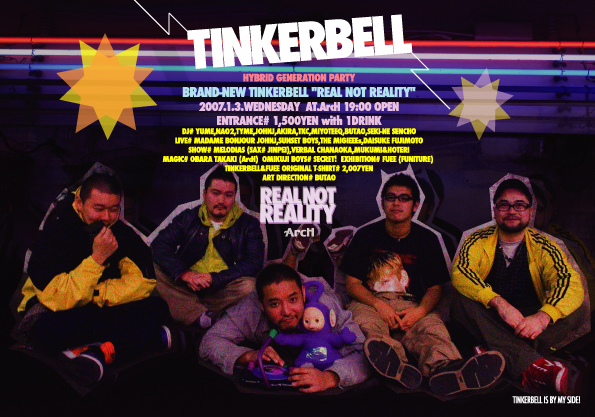 サンセットボーイズとはじける新年会を!。 お正月を祝おう!。ショータイムやライブやDJで抱腹絶倒〜。 新しい出逢いもあるさ!。 TINKERBELL VOLUME.THREE "REAL NOT REALITY" 2007.1.3.WEDNESDAY AT.ArcH OPEN#19:00-CLOSE:5:00 ENTRANCE#1,500YEN(1DRINK) DJ#YUME,NAO2,TYME,JOHNJ,AKIRA,MIYOTEEQ,BUTAO,SEKI-NE LIVE#SUNSET BOYS,MADAME BONJOUR JOHNJ,THE MIGIEEEs,藤本大祐 SHOW#MELODIAS (SAX#JINPEI),VERBAL CHANAOKA,MUKUMI&HOTERI MAGIC#OBARA TAKAKI EXHIBITION#FUEE(FUNITURE) TINKERBELL×F