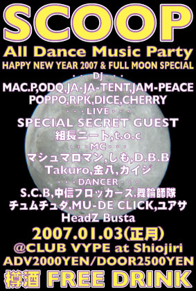 告知失礼します。 スピナ●ルと愉快な仲間達が廃墟をCLUBに大改造した事件から始まるダンスパーティーです。 2年ぶりに開催される今回のSCOOPは、 2007年最初の満月の夜の下、オーディエンスを魅了させる事間違いなしのSCOOPゆかりのスペシャルゲストLIVEをはじめ、 前回のSCOOPでも好評であったブレイクダンスバトル、 カワイイ×カッコイイ×SEXYを併せ持つ、 GIRLS DANCEチームのSHOW TIME、 長野のレゲェシーンを引っ張るSOUND CREWなど SCOOP史上、最高のメンツが集結!! 最高の夜をヒートアップさせるHOTなDJ陣