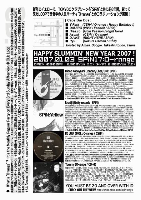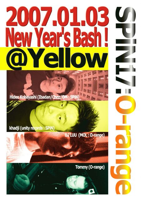 SPiN:O-range New Year's Bash @ Yellow 新年のYELLOWで、TOKYOのクラブシーンを共に約6年間、彩って来た"SPiN"と"O-range"とのコラボレーションが実現!! ■お年玉企画■ 先着30名様にO-rangeクルーとSPiNクルーが選曲したSpecial CD-Rをプレゼント! Floor: Hideo Kobayashi、Khadji、DJ LUU、TOMMY Lounge:Y-Park、Åsumi、Ike、Ryu、Hisa.co、Daijiro http://mixi.jp/view_album.pl?id=959322