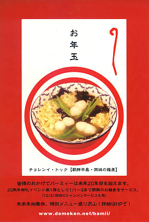 あけましておめでとうございます。 2007年のバーミィーでは、1/3まで 朝鮮半島開城のお雑煮「チョレンイ・トック」のサービスがあります^^ 今年もバーミィーをよろしくお願いします。 写真左/イベントのお知らせカード 写真右/2007年カウントダウン恒例、シャンパンをあけるイサムさん。