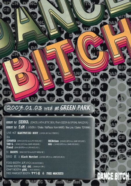 ●1/3(TUE)@GREEN PARK● 【DANCE BITCH】 OPEN 18:00 START19:00 ADV \1500 DOOR \2000 【GUEST DJs】 ★SENNA FaM(☆OVER☆/Shake/Rafflesia)from TOYAMA 【LIVE ACT】 ELECTER BODY(HIROYUKI)from TOKYO 【DJs】 COVATCH(HIDA MUCIS FESTIVAL) http://mixi.jp/show_friend.pl?id=345063 SHINchan(HIDA MUCIS FESTIVAL) TAK-L(WIDE RENGE) Freud(New Traze) nAo(WIDE RENGE) 【VJ】 HAYATO(HIDA MUCIS FESTIVAL) 【DECO】 匠(HIDA MUCIS FESTIVAL) BLACK MARCKET(HIDA M