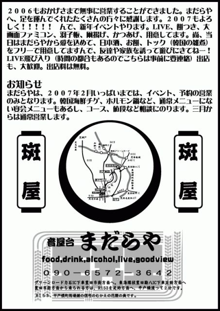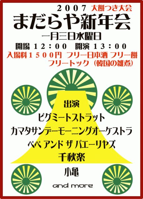 告知さしてもらいます。 ”2007まだらや新年会” 開場12:00 開演13:00 入場料1500円 お餅、トック、日本酒フリー 場所 まだらや 出演 PIG MEET STRUT カマタ サンデーモーニング オーケストラ ぺぺ アンド ザパエーリヤズ 千秋楽 小亀 and more DJ RYUJIO ノン and more 飛び入り歓迎!! 出店大歓迎!!出店料無料!!