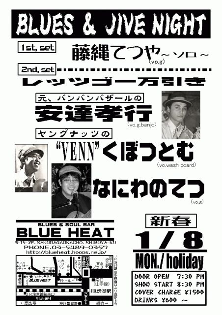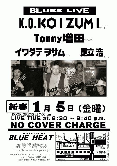ブルーヒート今夜5日、いや新年最初のライブはK.O.KOIZUMIさんのBLUES LIVEです。ノーチャージで、ワンステージだけのライブです。小泉と増田さんのツインギター&ヴォーカルです。 1月8日(月・祝)は、BLUES&JIVE、ライブです。元バンバンバザールの安達孝行さん、ヤングナッツのVENNさん、そして藤縄哲也さんとでの超強力、超豪華な編成でのライブにです。必見です。