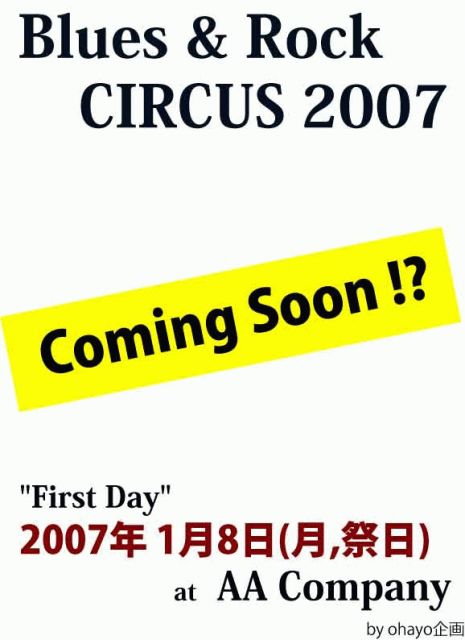 いよいよ始まります! 「Blues & Rock CIRCUS 2007」第1弾! スタートはここ、AAカンパニーから! 以下詳細です! @@@@@@@@@@ 「Blues & Rock CIRCUS 2007」 1月8日(月曜、祭日) 立川AAカンパニー http://aaclive.com/index.html OPEN/19:00〜 START/19:30〜 Charge/¥1500(ドリンク付き) 4セットで3バンド出演、ラストはゲスト陣を交えて演奏バトル! 19:30〜 コマネチーズ 20:20〜 ダイアモンドダスト 21:00〜 The C62 21:50〜 Circus circusゲスト陣 スペシャルゲスト陣では C6