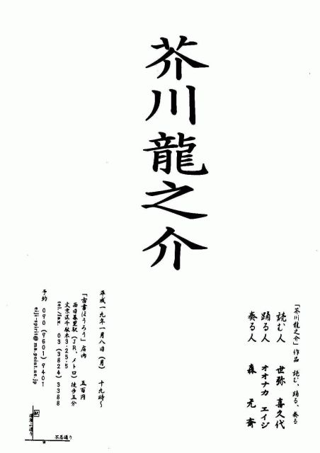 古本屋にて ジャンルの異なる3人が芥川作品を表現します。 読む人 世弥 喜久代 踊る人 オオナカ エイジ 奏る人 森 元斉 平成19年1月8日(月) 19:00〜 「古書ほうろう」店内 500円 会場の設営上、なるべくご予約下さい。 西日暮里駅(JR、メトロ)より徒歩5分 文京区千駄木3−25−5 tel./fax. 03(3824)3388 http://www.yanesen.net/horo/ 予約 eiji-spirit@ma.point.ne.jp
