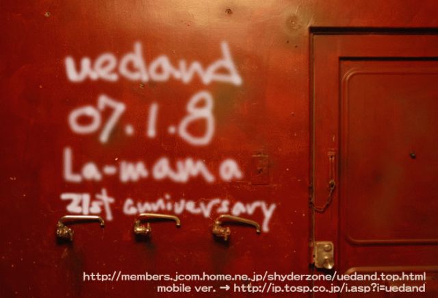 ウチのイベントに出て頂くことになりました。 07年1月8日(月・祝) 17:30open/18:00start adv\3,000/day\3,500 uedand 21st anniversary gig 『またまた星人の日?しゃいだぁが爆発する日5』 出演 ★uedand ★寒空はだか ★云うだけ番長 しゃいだ番長(uedand) のいじ番長(DUSTAR-3) おとべ番長(The Transformer/AN'S ALL STARS/BFU) ★アタックチャンス '67 マコリン(ギター&唄/uedand) ミッチー(ギター&唄/ハニワニバイシクル) セイボー(ベース&唄/夜叉) アキリン(ドラム&唄/犬神サーカス団) チケッ