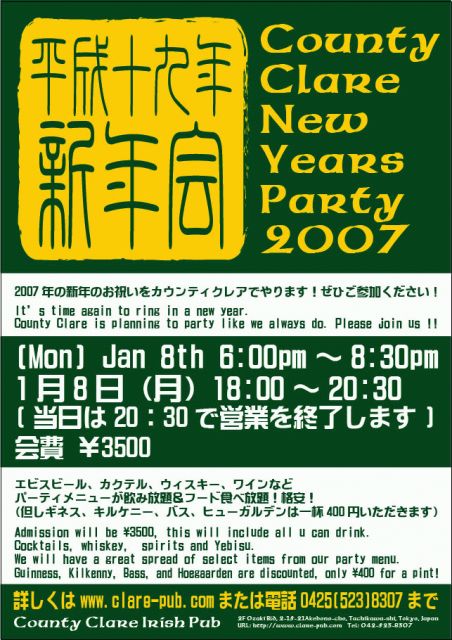2007年の新年のお祝いをカウンティクレアでやります。ぜひご参加下さい!! 1月8日(月といっても祝日です!)18:00〜20:30 (当日は20:30に営業を終了いたします! 会費は飲み放題…そして食べ放題がついて¥3500ポッキリ! エビス、カクテル、ウィスキー、ワインなどなど飲み放題!またおいしい、おいしいカウンティクレアのフードメニューが何と食べ放題でこの価格! 詳しくは当店HP www.clare-pub.com また電話042-523-8307まで…