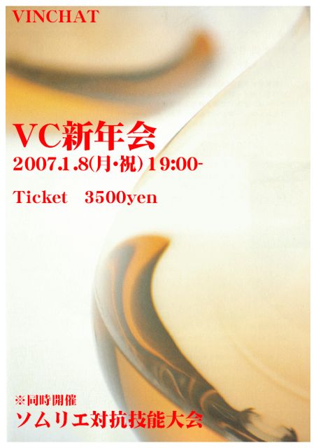ちょっと、気が早いような気がしますが・・・ すでに告知が出ていたのでお知らせいたします 2007年1月8日(祝日:成人の日) 19:00〜 3500円 新年会です。 同時開催 ソムリエ対抗競技大会 お申し込みは、お店に直接おねがいしますね☆ http://www.vinchat.net/osirase/wwwforum.cgi?id=9&az=msg&number=94&page=