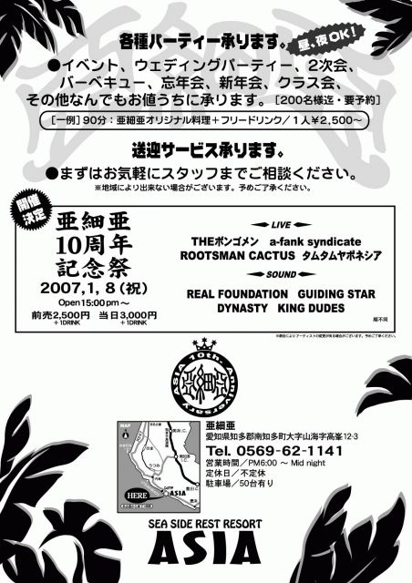 "ASIA 10th Anniversary"イベント ■2007/1/8(祝MON) ■@ASIA 山海 ■OPEN 3:00PM ■TICKET 前売¥2,500(+1D)/当日¥3,000(+1D) ■LIVE ★a-fank syndicate ★THE ボンゴメン ★ROOTSMAN CACTUS ★タムタムヤポネシア ■SOUND ★REAL FOUNDATION ★GUIDING STAR ★DYNASTY ★KING DUDES ※info..... ASIA 0569-62-1141 PIMP & PIMPLION、各協賛店にてTICKET好評発売中! (予約も受付中です。) 10周年おめでとうございます。Yah man!!!