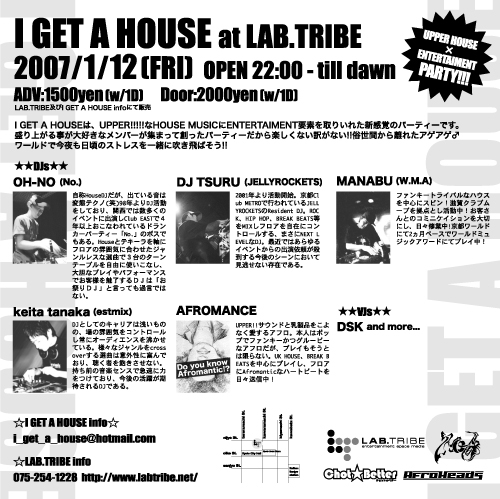 I GET A HOUSEは、UPPER!!!!!なHOUSE MUSICにENTERTAIMENT要素を取りいれた新感覚のパーティーです。盛り上がる事が大好きなメンバーが集まって創ったパーティーだから楽しくない訳がない!!俗世間から離れたアゲアゲ♂ワールドで今夜も日頃のストレスを一緒に吹き飛ばそう!!