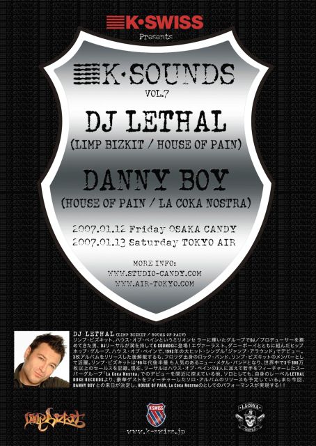 管理人様、告知失礼いたします。 K-SWISS presents K-SOUNDS vol 7 DJ LETHAL / LIMP BIZKIT DANNY BOY / HOUSE OF PAIN, LA COKA NOSTRA 2007 1.12 ( FRI) 大阪 STUDIO CANDY info : www.studio-candy.com 2007 1.13 ( SAT) 東京 AIR info : www.air-tokyo.com 2006年4月から開催しているイベント‘K-SOUNDS'。 海外よりrock musicianをdjとして招聘し、今までPETER HOOK / NEW ORDER, KARL BARTOS / KRAFTWEAK, BEZ& GAZ / HAPPY MONDAYS, SLIM JIM PHANTOM / STRAY CATS, ANDY ROUKE / THE SMITH, RICHARD FEARLESS