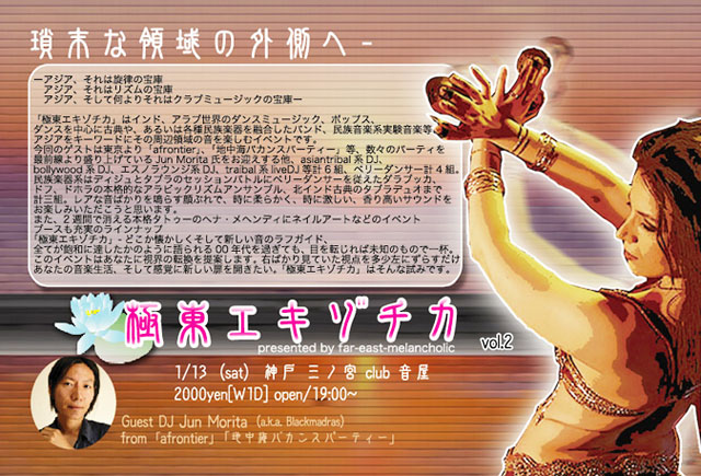 関西ではまだ比較的レアなアジアン系クラブイベントとして、 去る11月18日に第一回目を開催したのですが好評だったので、早くも第二回目を決定しました! 「極東エキゾチカ」はインド、アラブの世界のダンスミュージック、ポップス、ダンスを中心に古典や、あるいは各種民族楽器を融合したバンド、民族音楽系実験音楽等アジアをキーワードにその周辺領域の音を楽しむクラブイベントです。 次回1月13日(土)のゲストは東京より「afrontier」、「地中海バカンスパーティー」等、数々のパーティーをシーンの最前線より盛り上げておられるJun Morit