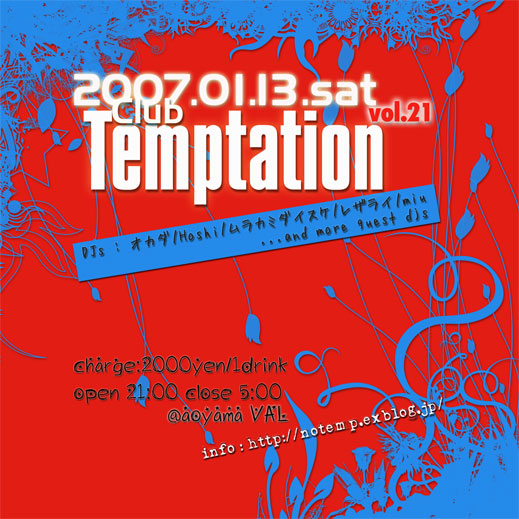 club Temptation vol.21 2007.1.13.sat Door Open 21:00 @ Aoyama VAL / http://www.vwal.net/val/ 2000yen/1drink DJs : オカダ, Hoshi, ムラカミダイスケ, レザライ, miu and many more guest DJs! info : http://notemp.exblog.jp/