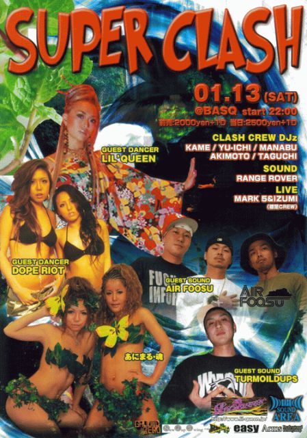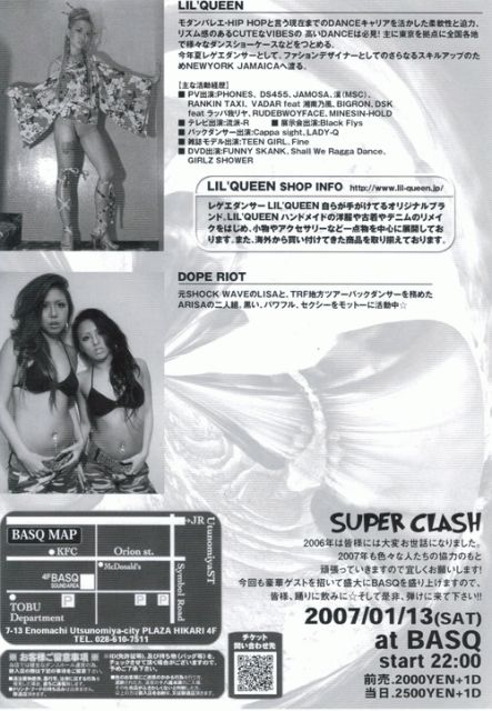 SUPER CLASH 2007/01/13 SAT AT BASQ SOUNDAREA START 22:00〜 TICET 前売:2000yen〔+1D〕      当日:2500yen〔+1D〕        GUEST DANCER LIL'QUEEN DOPE RIOT GUEST SOUND AIR FOOSU TURMOILDUPS CLASH CREW DJz KAME/YU-ICHI/MANABU/AKIMOTO/TAGUCHI SOUND RANGE ROVER LIVE MARK 5&IZUMI(襟足CREW) DANCER あにまる・魂