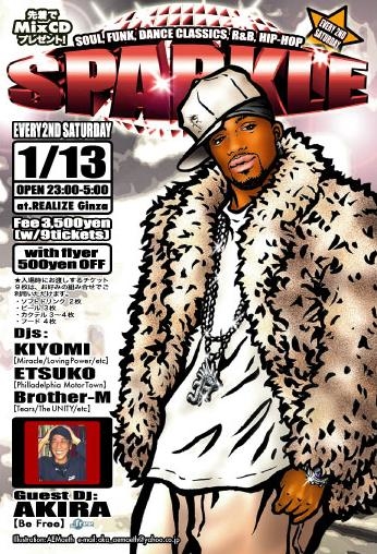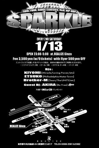 "SPARKLE"(毎月第2土曜日23:00〜開催!) @REALIZE Ginza 毎月弟2土曜日23:00〜華の銀座でお送りしているイベントです!昨年12月はゲストDJにDJ OSSHYを迎えて盛り上がりました!☆SPARKLEはダンクラ、Funk、Soulから最新R&B・Hip-Hopまで、Black Music全般を楽しんで頂けるイベントです! 2007年1月のSPARKLEは1/13(土)に開催です!レギュラーのKIYOMI、ETSUKO、BROTHER-Mの3人+ゲストDJに、都内各所で活躍しているDJ AKIRA(Be Free)が2回目の登場です!ご期待くださぁいっ!2007年も皆さまと一緒に楽しい時