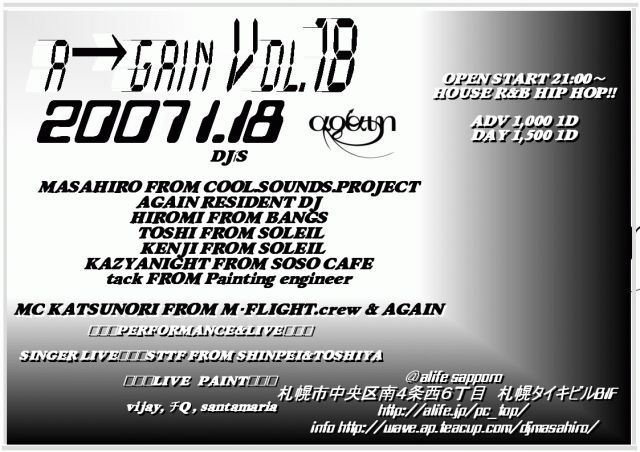 ¿·Ç¯²ñ¡ùa¢ªgain VOL.1£¸¡¡£±·î18Æü ˺ǯ²ñ¤Ï·âÄÀ¼Ô¤â½Ð¤ÆÂçÊѤʤ³¤È¤Ë¤Ê¤Ã¤Æ¤Þ¤·¤¿¤¬¡¢ º£²ó¤Ï¤É¤¦¤Ê¤ó¤Ç¤·¤ç¤¦¤«¡©¡© ¿·Ç¯£±È¯Ìܤâ¤É¤¦¤¾¤è¤í¤·¤¯¤ª´ê¤¤Ãפ·¤Þ¤¹¡£ DJ¡ÇS MASAHIRO FROM COOL.SOUNDS.PROJECT AGAIN RESIDENT DJ http://mixi.jp/show_friend.pl?id=556307 HIROMI FROM BANGS http://mixi.jp/show_friend.pl?id=599329 TOSHI FROM SOLEIL http://mixi.jp/show_friend.pl?id=2101092 KENJI FROM SOLEIL http://mixi.jp/show_friend.pl?id=216607 KAZYANIGHT FROM SOSO CAFE http://mixi.jp