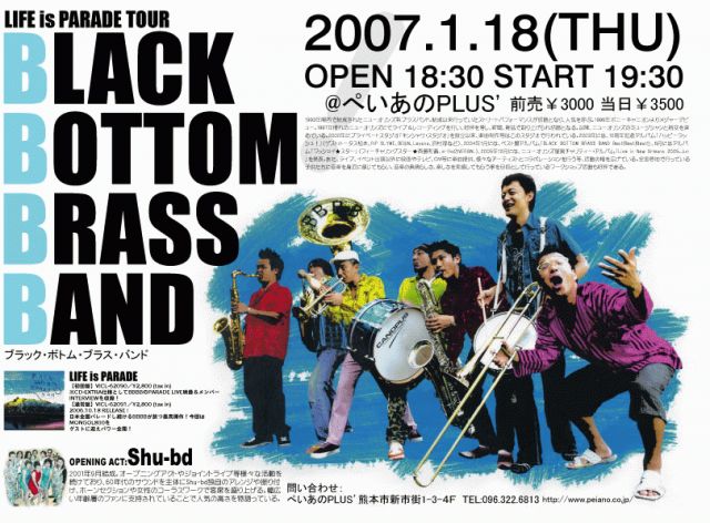 ¡ù2007.1.18¡ÊÌÚÍËÆü¡Ë LIFE IS PARADE TOUR BLACK BOTTOM BRASS BAND in kumamoto OPENING ACT : Shu-bd ADV 3000YEN DAY 3500YEN TICKET INFO: ¤Ú¤¤¤¢¤ÎPLUS 096.322.6813 -!-!-!-!-!-!---------------- ¤ª»þ´Öµö¤¹¸Â¤ê¤ªÉÕ¤¹ç¤¤¤è¤í¤·¤¯¤ª´ê¤¤¤¤¤¿¤·¤Þ¤¹¡£