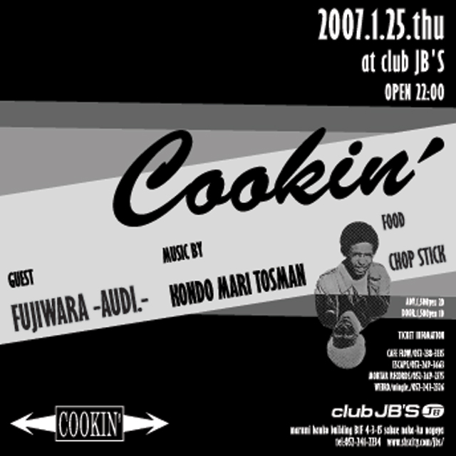 1/25(木)にJB'Sにて『COOKIN'』をやります〜。 ゲストDJには、AUDI.@MAGOからFUJIWARAさんに出演して頂きます! あとCHOPSTICKがフードで参加してくれます! ジャンルはhouse,jazz,hiphop,soul,funk,discoなどです。 -COOKIN'- 2007. 1.25.THU at NAGOYA club JB'S http://www.shscity.com/jbs/ ADV:1500yen/2DRINKS DOOR:1500yen/1DRINK OPEN;22:00〜 -GUEST DJ- FUJIWARA(AUDI.) -DJ's- MARI TOSMAN KONDO -FOOD- CHOPSTICK