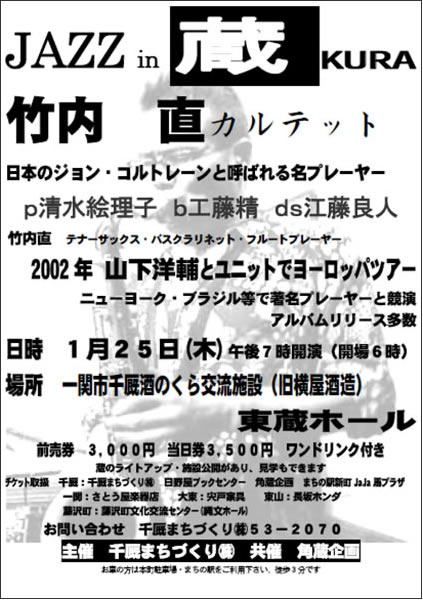「角蔵ホール」のライブではありませんが、角蔵企画が共催のライブに付き、情報を掲載します。 ■出演:竹内直カルテット ・竹内 直(bcl, t.sax)(http://www.geocities.jp/ts_nao/) ・清水絵理子(p)(http://www8.ocn.ne.jp/~ericcho/) ・工藤精(b)(http://hp.kutikomi.net/kudoushow/) ・江藤良人(ds)(http://www.paw.hi-ho.ne.jp/eto-drummer/) ■会場:一関市千厩酒のくら交流施設(旧横屋酒造) 東蔵ホール (一関市千厩町字北方134 地図はhttp://map.yahoo.co.jp/pl?nl=38.54.59.184&el=141.20.12.198) ■チケット: