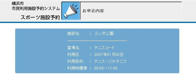 三ッ沢公園・テニスコート 2007/1/30 9:00〜11:00 料金:2200÷人数 ボールはわたしが用意します。 朝イチテニス 火曜日です。 あいてたんでとりあえずおさえました( ^ー^) 4〜6人希望。 毎度のことですが。。。 キャンセル料が発生しないよう まずは25日木曜の夜までの急募です( ^^)ノ!! アップしてダブルスのゲームをしましょう。 人数が多い&めちゃ寒い←こんなときは 運動量のある形式練習でもしましょう。 期限が迫っているため、 確実にこれる人の参加表明をお願いしますo(^-^o) どうぞふるって