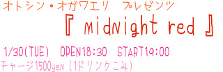 どうも!!三上さんと何回か競演させていただいております、アコースティック表現ユニット『オトシン』ギターのオガワエリと申します!! 三上さんをはじめ、色々なアーティストに出演していただくので 楽しい、味のあるイベントになること間違いなしなので 是非、熱い夜をすごしに来てください♪♪ 1/30(TUE) オトシン・オガワエリ初企画イベント 『midnight red』 OPEN18:30 START19:00 チャージ1500yen (1ドリンク込) 場所:長居Depo (御堂筋線長居駅5番出口を出て西へ。 アットホームなお洒落ライブバー) オガワ