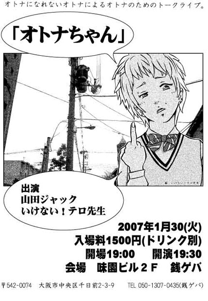 オトナになれないオトナのためのトークライブ 「オトナちゃん」 出演 山田ジャック いけない!テロ先生 1月30日(火) 入場料1500円(ドリンク別) 開場 19:00 開演 19:30 会場 銭ゲバ 住所 大阪市中央区千日前2-3-9味園ビル2F TEL/FAX 050-1307-0435