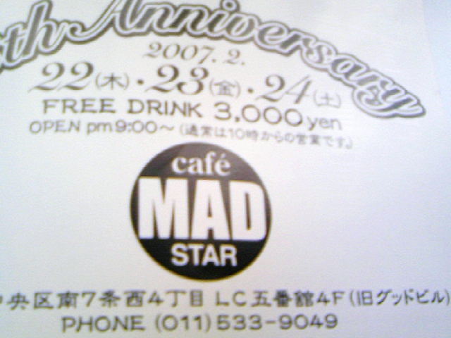よしっ。 ちゃんと管理人の仕事しよっとw(`・ω・´)ゞ 2007年2月22日(木)・23日(金)・24日(土) お待たせしました!! MAD−STARが周年祝いやります!!ヽ(´∀`)9 いつもは22時開店ですが21時から頑張ってるそうですw お一人様3000円ポッキリ前金制 飲み歌い放題(ノ*´▽)ノワーイ なんたって営業時間が計り知れないので 倒れた人から帰ってくださいwww ソファーで倒れてたら店外に運び出されることもあるかもしれません・・ ソファーで倒れられるのは・・ オーナーKENさ
