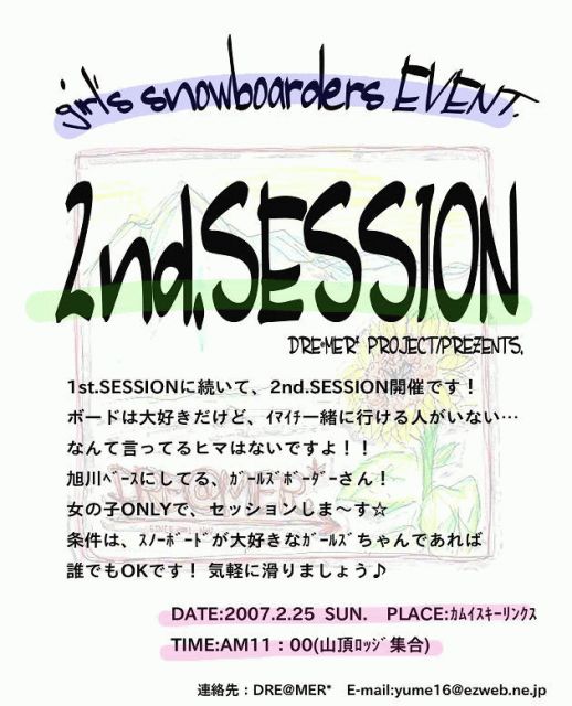 とりあえず、第1回が無事終わりまして… 1st.SESSIONオツカレサマでした!! さっそくながら、やっちゃいますよ! 2nd.SESSION!!!!! 前回が、いきなりだったので 今回は早めの予告!!!!! なので、早速ですがフライヤー一応作りました… ご賞味あれ!味はないけど アツいガールズだったら、来ちゃいなよ☆