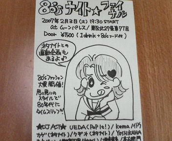 いつものように唐突に沈黙を破って 80'sナイトの開催が決定しました! 80'sファッションに身を包み 胸きゅんPOPS&ROCKで踊り明かす ゴキゲンなイベント80'sナイトの最終章 <80'sナイト☆ファイナル@ムーンパレス> 2007年2月3日開催決定です! 恒例の「80'sファッション大賞」も グランドチャンピオン大会の様相を呈する程 エスカレートすること請け合い!! 賞品&参加賞の駄菓子にも気合が入っています ※前回大賞賞品は「きまぐれオレンジロード」1〜10巻 エントリーしていただいた方、 ファッション大賞に投票して