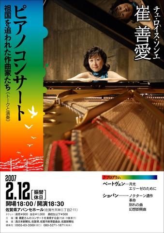 2007年 2月12日 (月曜、振替休日) 開場 18:00 開演 18:30 終演予定 20:30 佐賀県アバンセホール(佐賀市天神三丁目) 前売券 900円、 当日 1000円。 高校生以下 500円。 主催 : 崔 善愛さんのコンサートを実現する会 (代表:中園康子) 後援 : 西日本新聞社、佐賀新聞社、佐賀県、佐賀市教育委員会 問合せ電話 : 0955−63−3369(田口) 080−5271−1871(松永) 【略歴】 大阪に生まれ北九州市の小倉で育った。西南女学院中学・高校を