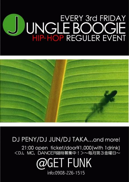 HipHop REGULER EVENT JUNGLE BOOGIE EVERY 3rd FRIDAY DJ's : PENY from CREWN.JP/JUN /TAKA/....and more @GET FUNK 21:00 open door\1000with 1drink (DJ DANCER RAPER SHOW 随時募集!お声をおかけ下さい)