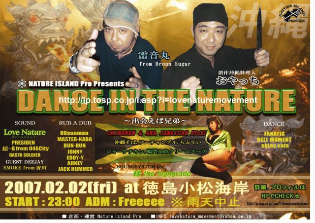 NATURE ISLAND PROMOTION PRESENTS 「Dance In The Nature」 〜LoveNature 3th ANNVERSARY〜part1 2007/2/2(FRI) @徳島小松海岸 START:23:00 ADM:FREEE ◇GUEST SOUND◇ 雷音丸 from BrownSugar ◇SOUND◇ LoveNature PRESIDEN 超-G from 046City RASTA SOLDIER ◇RUB A DUB◇ SMOKE A4J 89sanman MASTER-KABA BUN-BUN JONNY EDDY-Y AHKEY JACK HUMMER... ◇DANCER◇ FANATIC MANANG BELMOMENT 当日はOKINAWAN & AWA JAMAICAN FOOD出展♪ 沖縄そば、フーチャンプル、らふてい、ジャークチキン、鳴門金