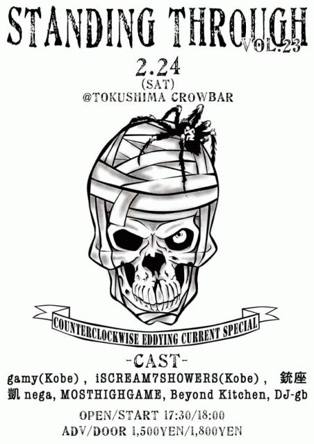 2007/02/24(Sat)@Tokushima CROWBAR 銃座&gbプレゼンツ [STANDING THROUGH Vol.23〜左廻り渦潮スペシャル〜] gamy & iSCREAM7SHOWERS SPLIT レコ発 番外編 【Band】 gamy(Kobe) iSCREAM7SHOWERS(Kobe) 銃座 凱Nega MOSTHIGHGAME BeyondKitchen DJ-gb OPEN/START 17:30/18:00 チケット ADV/DOOR \1,500/\1,800 12/9神戸でFINALを迎えたスプリットのレコ発が徳島でも実現! 迎え撃つ地元勢も多彩な顔ぶれw 四国だけでなく、全国からのお越しをお待ちいたしておりますw ※ビヨンドキッチ