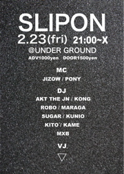 明日!! 2/23(fri) 21:00~X "SLIPON" @UNDER GROUND ADV,1000yen/1D MC JIZOW / PONY DJ AKT THE JN / KONG ROBO / MARAGA SUGAR / KUNIO KITO / KAME MXB VJ ∇