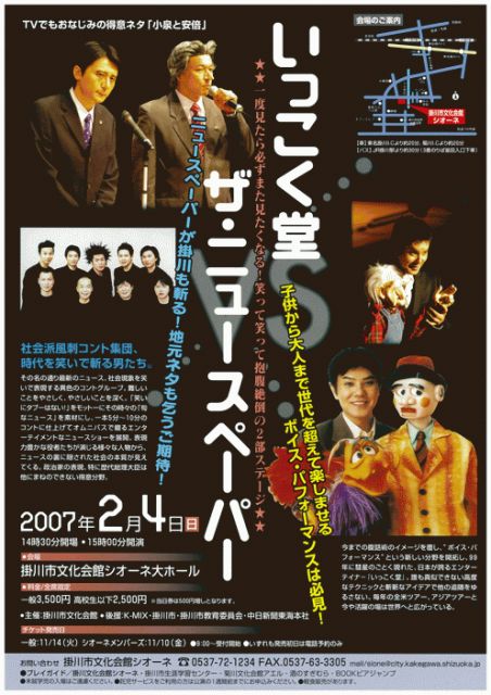 パントマイム・マンスリーの 熱冷めやらぬ2月4日(日)、 静岡の掛川市文化会館「シオーネ」で ”いっこく堂”さんとの ジョイントライブが行われます。 ヒデさん・アキラさんが先日出演した 地元ラジオ番組のPR効果、 また、パーソナリティが TNPの大ファンという事もあり、 チケットは残席わずか! 600席ほどの会場ですので、 後ろの席からでも充分楽しめる様です。 お早めにお申込ください。 <Live Info> ◆2/4(日)掛川市文化会館 「シオーネ」大ホール 『いっこく堂 VS THE NEWSPAPER』 14:30開場