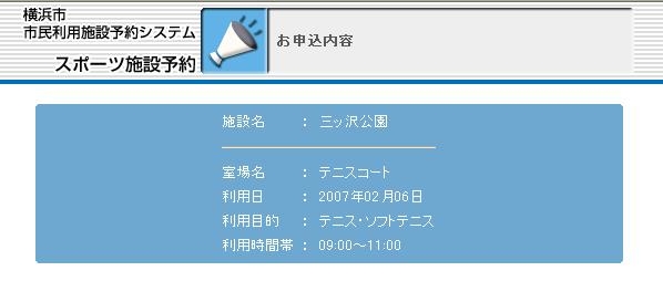三ッ沢公園・テニスコート 2007/2/6 9:00〜11:00 料金:2200÷人数 ボールはわたしが用意します。 朝イチテニス 火曜日です。 あいてたんでとりあえずおさえました( ^ー^) 4〜6人希望。 毎度のことですが。。。 キャンセル料が発生しないよう まずは2/1木曜の夜までの募集です( ^^)ノ!! アップしてダブルスのゲームをしましょう。 人数が多い&めちゃ寒い←こんなときは 運動量のある形式練習でもしましょう。 期限が迫っているわけではありませんが、 できれば確実にこれる人の参加表明をお願いしますo
