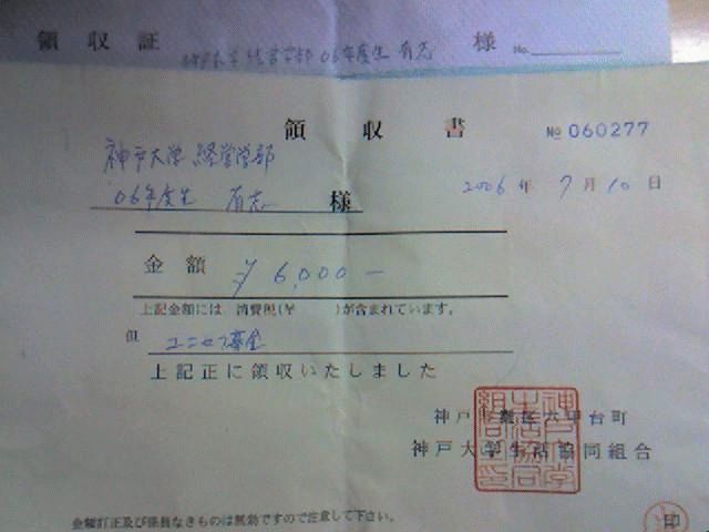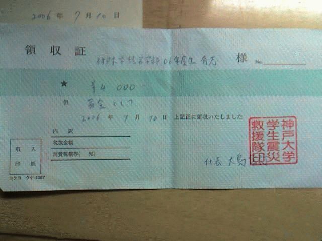 会計報告 遅くなりましたが、 7月4日に行われた「06入学経営学部生 全体パーティー」の会計報告をさせて頂きます。 収入の部 参加費 113,000円 (1,000円×113名) 合計 113,000円 支出の部 食費 50,000円 お菓子代 7,492円 ドリンク代 5,296円 景品 34,578円 文房具費 2,156円 名札代 1,322円 印刷代 1,810円 利益分 10,346円 合計 113,000円 利益分 10,346円 全額寄付 【内訳】 ユニセフ募金 6000円 同上(神戸大学生協の募