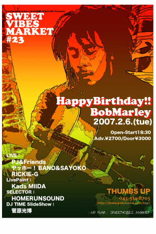 SWEETVIBES MARKET #23 詳細決まりました! FLYERもデザイン完成! 俺の尊敬する人BOB MARLEYの誕生日、SVMは前後の週末とかじゃなく、ドンピシャその日にやります。 出演者充実。来ないと損する内容です。 みんなでBOBと遊びましょう!