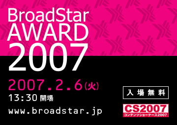 =============================================================== 〜表彰式&映像イベント〜 BroadStar Award 2007開催!! (2月6日(木)14:00〜大阪産業創造館) =============================================================== 拝啓、ますますご清祥のこととお慶び申し上げます。 クリエイター発掘・支援サイトBroadStar(ブロードスター)では、 応募作品の中から優秀作品を選び表彰する【BroadStar Award 2007】 を開催致します。 今回は、特別審