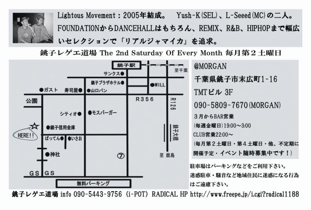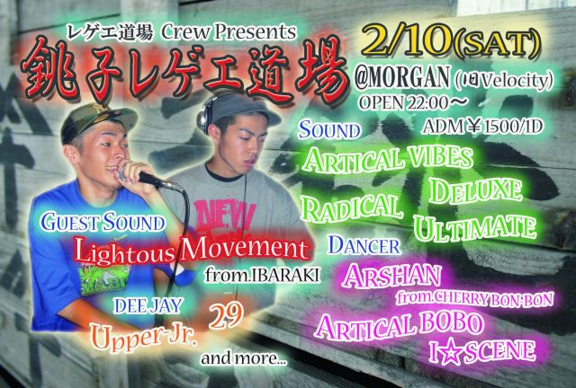 ☆銚子レゲエ道場☆ 2/10(sat) @MORGAN(旧Velocity) OPEN 22:00〜 ADM.\1500/1d (GUEST SOUND) ・Lightous Movement from.IBARAKI (SOUND) ・ARTICAL VIBES ・DELUXE ・RADICAL ・ULTIMATE (DEEJAY) ・29 ・Upper-Jr. and more... (DANCER) ・ARSHAN from.CHERRY BON-BON ・ARTICAL BOBO ・I☆SCENE @MORGAN 千葉県銚子市末広町 1-16 TMTビル 3F (MORGAN) 090-5809-7670 (RADICAL) http://www.freepe.com/ii.cgi?radical1188 (銚子レゲエ道場コミュニティ)