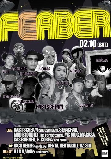 “FEABER” 2月よりBELTの偶数月第2土曜にレギュラーとして始まる “FEABER” HAB I SCREAM & KEEオーガナイズによる新イベントで、チバのヒップホップ大フィーバー!をもくろんでいる。 今までチバになかった一夜になる事は必至で、毎回チバ内外から駆けつけるアーティスト達がフレッシュな内容でお出迎え♪ LIVE: ■HAB I SCREAM (SOUL SCREAM) ■SEPACHAN ■MAD BLOODED (The CornaStones) ■MC MUG ■MAGASA ■GAS BURNER ■H-COBRA and more... DJ: ■JACK HERER (妄走族) ■KENTA ■K