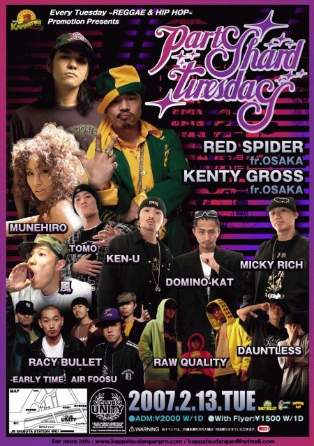■OPEN ・0:00〜TILL MORNIG ■料金 ・ADM:\2000/1D ・W/F:\1500/1D ■Sound ・RED SPIDER fr.OSAKA ・RAW QUALITY ・DAUNTLESS ・RACY BULLET ■Showcase ・KENTY-GROSS ・風 ・MUNEHIRO ・KEN-U ・MICKY RICH ・DOMINO-KAT ・TOMO ■Earlytime ・AIR FOOSU ■Info ・東京都渋谷区渋谷3-26-25 湯沢ビル ・TEL:03-5485-4011 ・FAX:03-5485-4010 ・mail:info@clubunity.co.jp
