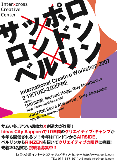International Creative Workshop 2007 @ ICC インターナショナル・クリエイティティブ・ワークショップ2007@ICC 2007/2/13-23 サイト:http://www.icc-jp.com/ja/index.html トマトなどとの多くのワークショップを手がけてきた、インターナショナル・クリエイティブ・ワークショップ@ ICCは、今回、ベルリンなどのワークショップや国際的なアートプロジェクト‘RMX’でも定評のあるRinzenと、近年インタラクティブな作品をコンピューターの有無にかかわらず探求しているAirsideのコラボレーションで行います。世界で活躍する二つのデ
