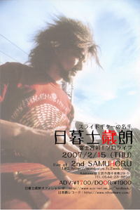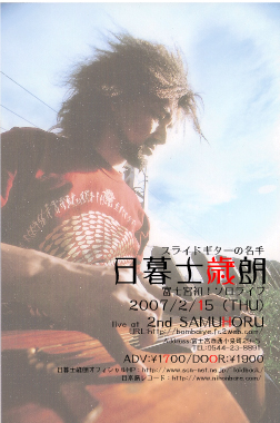 太鼓と関係しない【番外編】です。 ふとしたことから、スライドギターの名手と呼ばれ、 あのDAVID LINDLEYとも共演したギタリスト 『日暮士歳朗』氏の、富士宮初ライブのマネージメントを ちょっとお手伝いをすることになり、以下のように 決めることができました。 日にち 2007/2/15 木曜日 日暮士歳朗(所属:日本橋レコード) http://www.scn-net.ne.jp/~laidback/ 会場 2nd SAMUHOURU 住所:富士宮市西小泉町29-8 電話:0544-23-8891 スタート 20:00 エンド 21:30くらい 、 ※終了後は通常営業