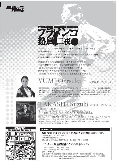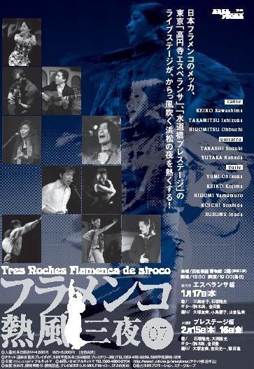 師匠(などと ホントは恐れ多くて言えない) のライブのお知らせをさせてくださぃ♪ 東京ライブは完売のようですが 浜松の方は まだ チケットがあるようです 興味のある方 是非☆ 『フラメンコ熱風三夜 '07 〜水道橋・プレステージ編』 ■日時・会場■ 2月15日(木)・16日(金) 浜松 音楽工房(楽器博物館2F) 18:30開場 19:00開演 ■出演■ カンテ 石塚隆充 大渕博光 ギター 鈴木 尚 金田 豊 バイレ 大塚友美 吉田光一 稲田 進