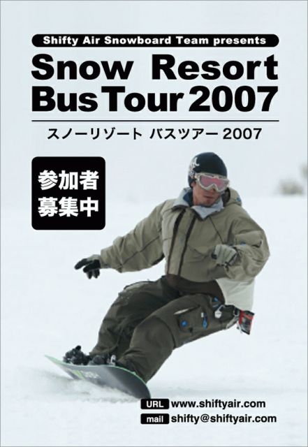 イベントの宣伝をさせてください。 ☆★ Shifty Air SnowboardTeam主催 スノーリゾートツアー2007 ★☆ *** 2007/1/23 New !! *** 申し込みがホームページからできるように *** なりました!! http://shiftyair.com/ *** PCでも携帯からでもできます。 暖冬でなかなか雪が降らなくてやきもきしていましたが、やっと雪山の季節がやってきました! Shifty Air Snowboard Teamでは今年もスノーリゾートツアーをやります! 新宿集合で、大型バスに乗り込み、一路雪の待つ黒姫高原へ。往復貸切バス