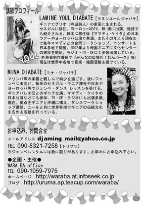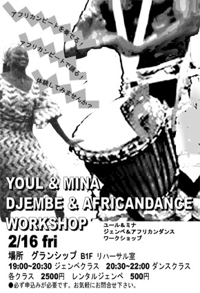 http://uruma.ap.teacup.com/waraba/256.html YOUL & MINA DJEMBE &a AFRICAN DANCE WORKSHOP ユール&ミナ ジェンベ&アフリカンダンス ワークショップ 『アフリカンピートを奏でる! アフリカンビートで踊る! 体験してみませんか?』 ●2/16 (fri) 場所:グランシップ B1F リハーサル室 時間:ジェンベクラス 19:00-20:30 ダンスクラス 20:30-22:00 料金:各クラス ¥2,500/レンタルジェンベ ¥500 ★必ずお申込みが必要です。お気軽にお問い合わせ下さい。 [お申込み・お問合せ] メー