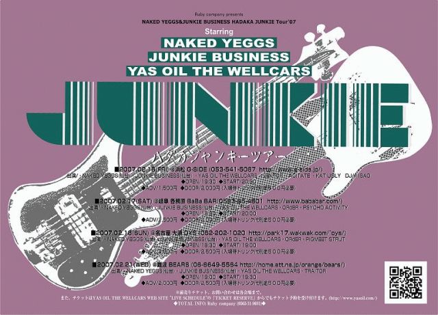 【NAKED YEGGS&JUNKIE BUSINESS 〜裸ジャンキー Tour〜】 ●2007.02.16(FRI) @浜松 G-SIDE (053-541-5067 http://www.g-side.jp/) ◆出演/NAKED YEGGS、JUNKIE BUSINESS、 YAS OIL THE WELLCARS、VEKTOR、AGITATE、KAT UGLY ◆DJ/ISAO ◆OPEN/19:30 START/20:00 ◆ADV/\1,500 DOOR/\2,000 (入場時にドリンク代別途\500必要) ●2007.02.17(SAT) @各務原 BaBa (0583-85-4801 http://www.bababar.com/) ◆出演/NAKED YEGGS、JUNKIE BUSINESS、 YAS OIL THE WELLCARS、ORdER、PSYCHO ACTIVITY ◆OPEN/19:30 START/20:00