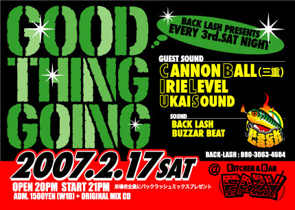 BACK-LASH PRESENTS GOOD THING GOING 2007 ★ SPESIAL GUEST SOUND ★ CANNON BALL (三重) ★ GUEST SOUND ★ IRIE-LEVEL / UKAI-SOUND ★ EARLY WARM ★ BUZZER BEAT ★ REGIDENT SOUND ★ BACK-LASH OPEN20:00 START 21:00 CLOSE 2:00 ADM. 1500YEN(W1D+MIXCD) EAZY 第3土曜日レギュラーナイト GOOD THING GOING ! 今回のゲストはお隣三重県より『 CANNON-BALL キャノンボール 』と地元岐阜から『 IRIE-LEVEL 』と『 UKAI-SOUND 』を迎えての SOUND NIGHT !!!! 今回より都合により2時終了となりますので 早めの