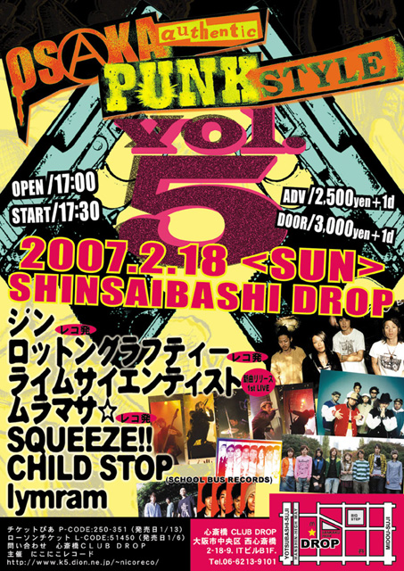 ダイブ率100%! モッシュ率100%! SKAダンス率100%! よかったら 是非、遊びに来て下さいですっ!! 『OSAKA authentic PUNK STYLE VOL.5』♪♪ 日時 2月18日(日) 開場 17:00 開演 17:30 場所心斎橋DROP 前売り2500円 当日3000円 (1ドリンク別) コード P-CODE:250-351 (発売日1/13) L-CODE:51450 (発売日1/6) 心斎橋CLUB DROP 06−6213−9101 にこにこレコード→ http://www.k5.dion.ne.jp/~nicoreco/ ▽ ムラマサ☆ (レコ発) ▼ ジン☆